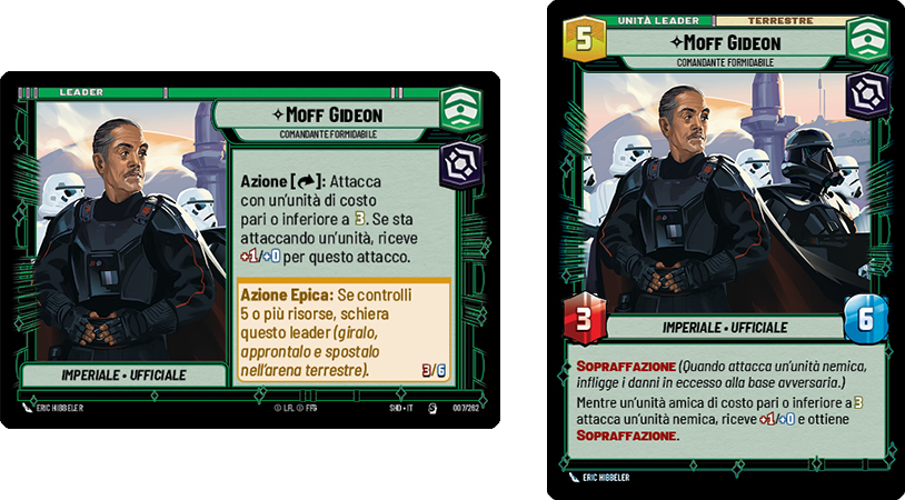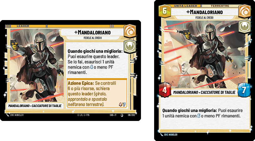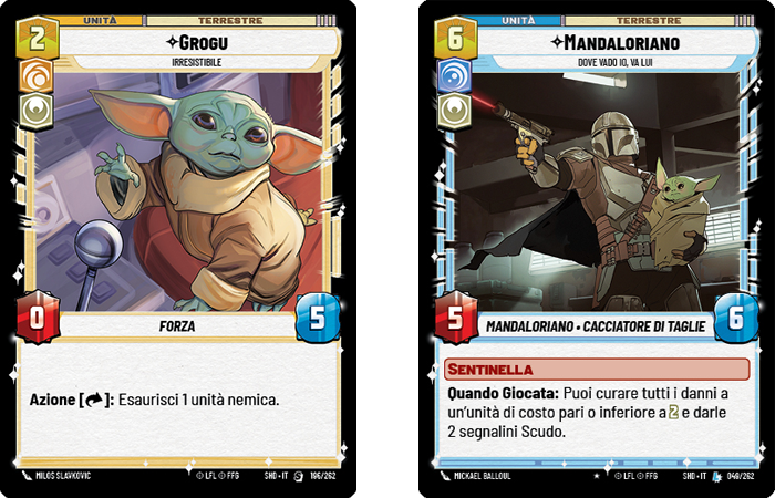 | Una delle carte più attese, la carta unità Grogu, permette ai giocatori di esaurire un’unità nemica, rispecchiando le potenti ma estenuanti abilità di Grogu viste nella serie Disney+, The Mandalorian. Questa carta, in combinazione con la carta unità Mandaloriano, rappresenta il legame protettivo tra i 2 personaggi, offrendo ai giocatori una nuova profondità strategica e un gameplay tematico. |