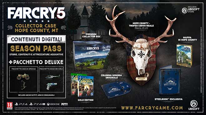 Per ampliare ulteriormente l’esperienza di gioco, la Hope County, MT Collector’s Case darà accesso al Season Pass di Far Cry 5, che include storie, contenuti ed equipaggiamenti aggiuntivi, oltre al Pacchetto Digital Deluxe, che comprende ulteriori veicoli, armi e abiti.